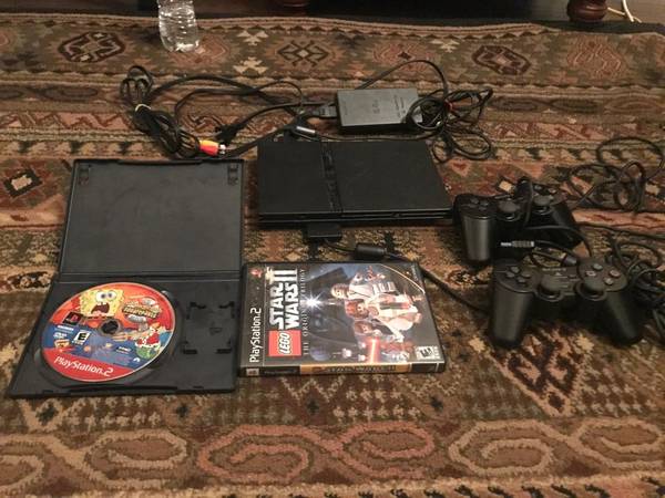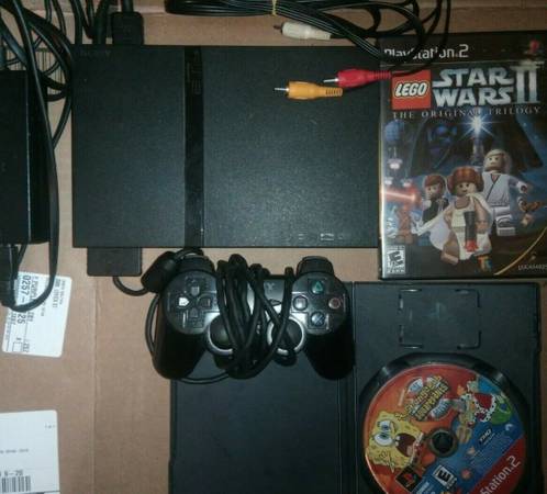 Sony PlayStation 2 Slim Launch Edition Charcoal Black Console (SCPH-75001CB).Comes with video cables, two controller and ac adapter. Its Tested and works. Comes With one Games Star Wars 2.
