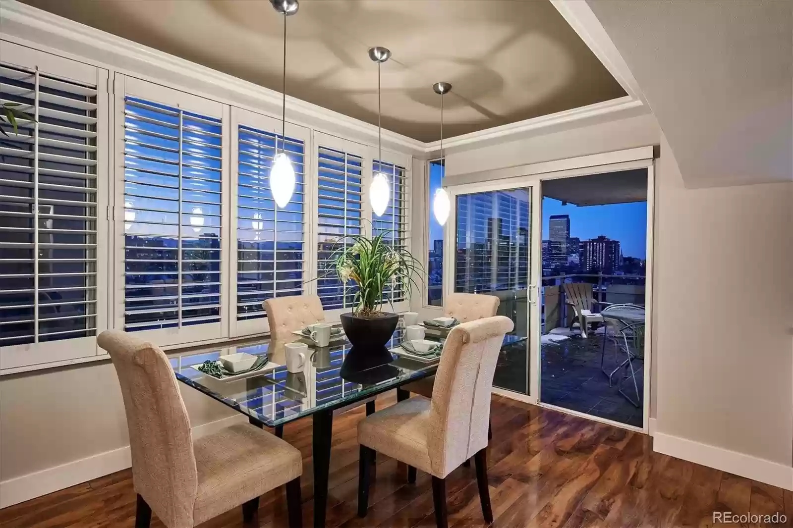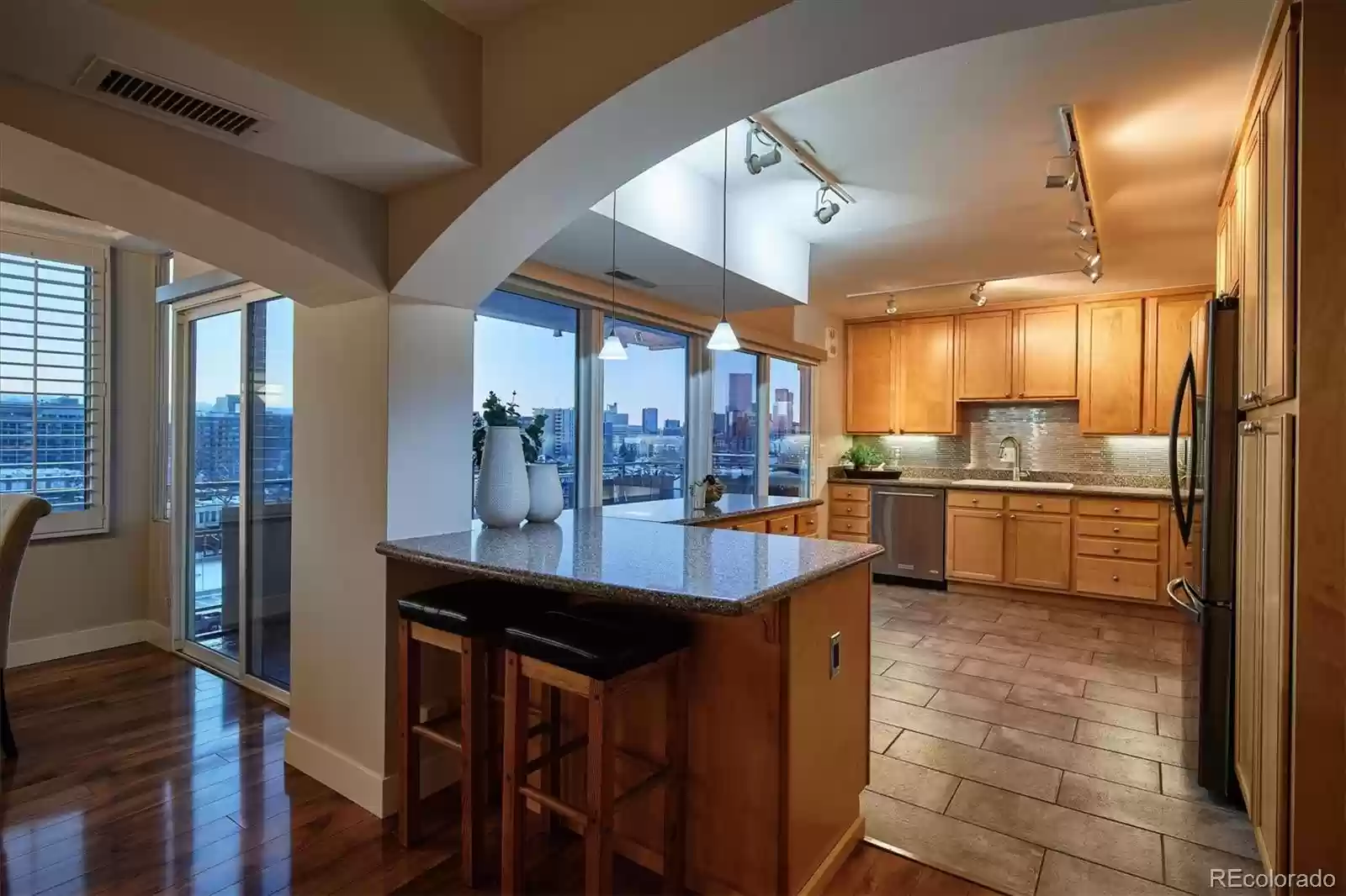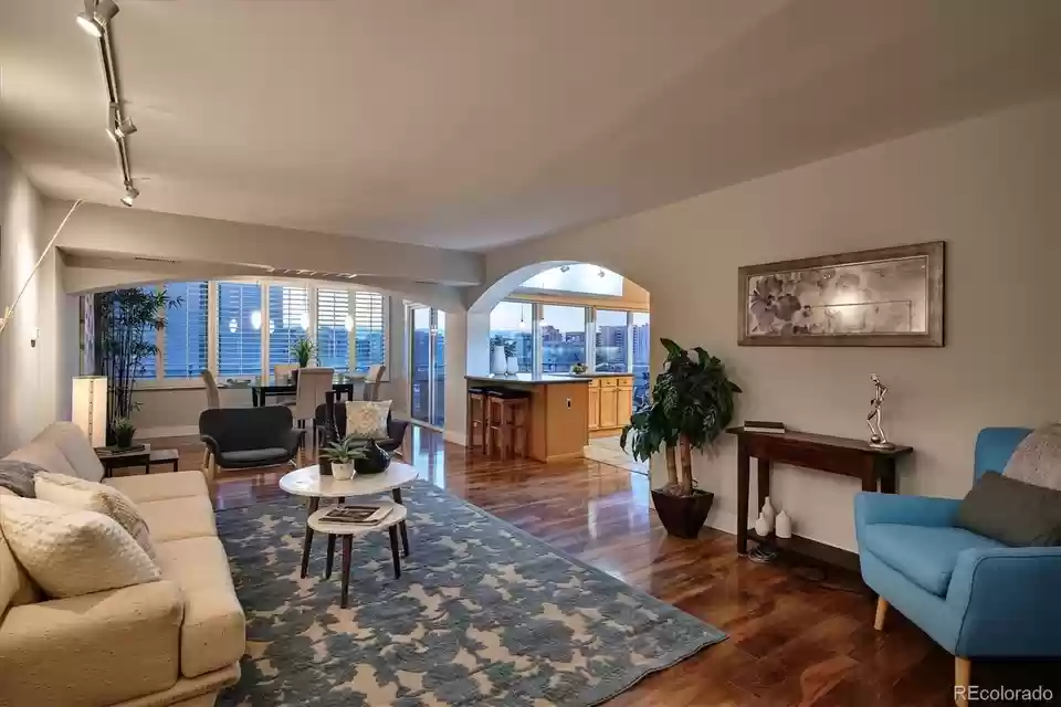 Incredible Mountain & City Views!! Updated Two Bedroom/Two Bath condo located in The Lanai. Enjoy the city lifestyle with maintenance free living... Close to Downtown, Governor's Park, Golden Triangle, and Cherry Creek ... parks, restaurants, shopping, and galleries minutes away! Step inside your unit and the views welcome you from the living room, dining room and kitchen.... An Open floor plan with an oversized Dining area and expansive gourmet Kitchen that includes stainless steel appliances, 42 cabinets, solid surface counters, decorative backsplash and tile floors. Both Bathrooms are upgraded and updated. Newer windows. Six panel doors, and 5 baseboards. Built in shelves/cabinets in the hallway leading to the Primary and secondary bedrooms. The primary suite includes 2 closets and a spa like bath complete with a jetted tub. The outdoor balcony is perfect for enjoying the evening sunsets.