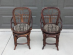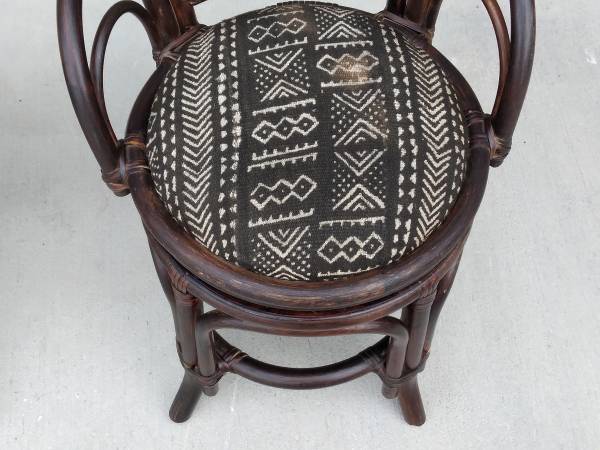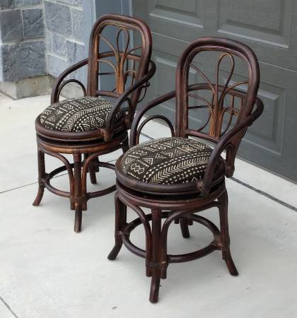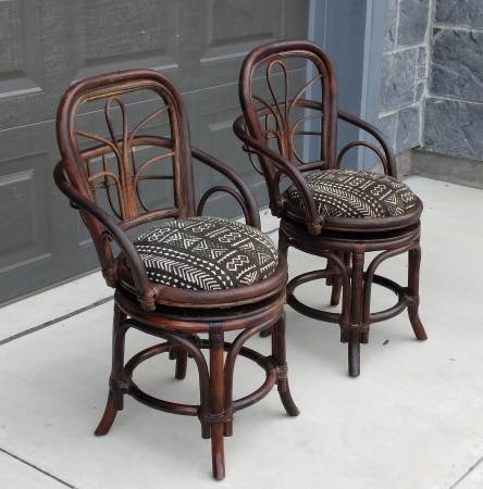 Excellent vintage condition. A rare find for bamboo Rattan collectors. These swivel chairs are of a rare style with what appears to be a magazine or newspaper rack on the back rest. Both swivel smoothly with plush tribal print cushions. Cosmetic wear consistent with age and use. These are smaller frame swivel chairs ideal for a small apartment or patio area. See pics for details. Asking $250 cash pick up.